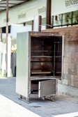 Копчення проводиться на решітках або на гачках.Температура контролюється термометром на дверях.